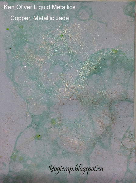 PS: mark or identify which end you will be blowing through so you don't accidentally get inks all over your mouth... I used Copper first. Found it a bit too light so added the Jade and continued playing with the bubbles on white 110# cardstock. You can see some of the sparkle from the metals. |