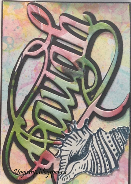 ![]() This ATC stamped with Pink Ink Designs "Shells" using Versafine Clair "Twilight" and clear embossed, then fussy cut. The die cut word cut from tissue box cardstock and adhered to a black shadow layer. |