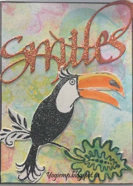 ![]() This ATC stamped with Pink Ink Designs "Toucan" using the Twilight ad embossing with Emerald Creek Seth Apter "Eclipse" embossing powder. The beak colored with Tombow markers. The die cut word cut from a misc cardstock, inked with Versafine Clair "Golden Meadow" end embossed with Emerald Creek "Thanksgiving" embossing powder. |