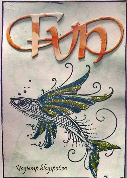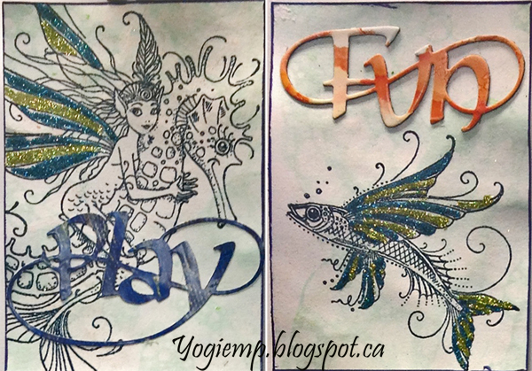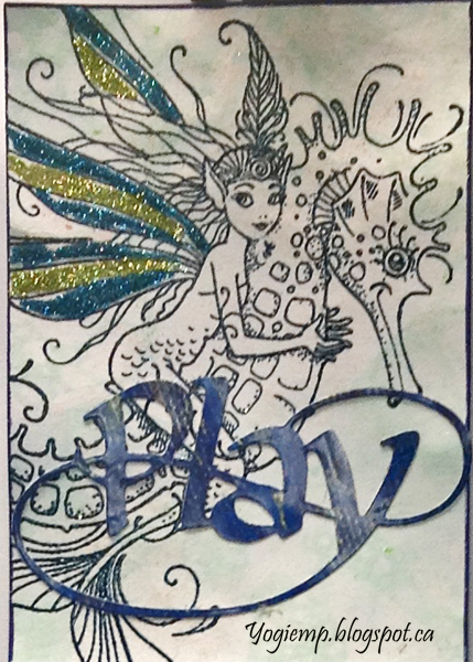 Both ATC's use Pink Ink Designs "Sea Nymphs" stamped using Versafine Clair "Twilight" and clear embossed. Wings and fins highlighted with Quickie glue pen and sprinkled with "Peacock Blue" and "Chartreuse" micro fine glitter. Play word die cut from a blue marbled scrapbook paper pad.