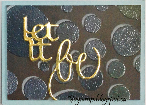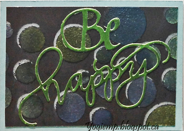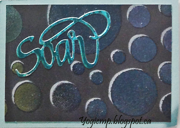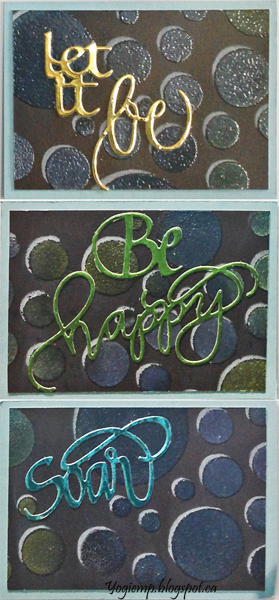 I had created the stencil background a few days ago and it was laying on my table so figured I'd use it since I couldn't figure out what I wanted to do with it for a card... On black cardstock using Phil Martin - Sentimentally Yours "Scattered Citrcles stencil and Distress Oxides. They're not as opaque as I would have liked... I used "Broken China", "Mustard Seed" and "Twisted Citron". then clear embossed. Created the highlight using a Prisma colored white pencil. Each word die cut from a metallic cardstock "Let It Be" from gold; "Soar" from a beautiful aqua blue; and "Be Happy" from a lime green" |