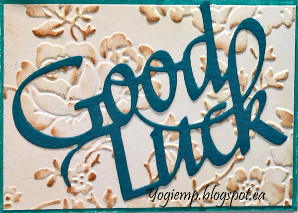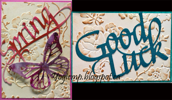 Die cut the word "Spring" from a tissue box cardstock. The butterfly from an alcohol decorated glossy paper. The Good Luck from a green cardstock Adhered the spring ATC to a pink cardstock and the "Good Luck" ATC to a green cardstock. |