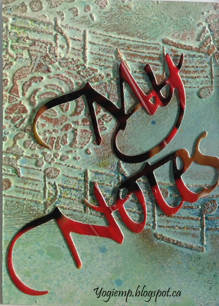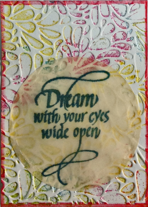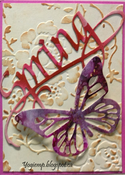 This background was I think created with acrylic paints on a glossy kind of thick paper. Stamped the quote with the Twilight and clear embossed. The butterfly is from my stash, cut from a thermal web decorated glittered pink cardstock. |