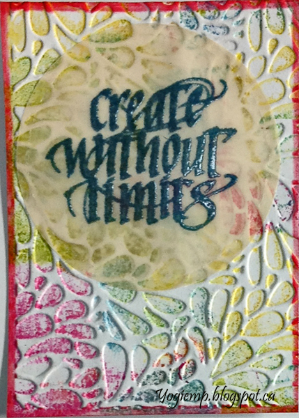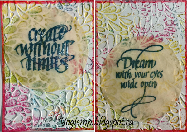 Inked up the embossing folder and ran through my machine. Stamped the quotes onto a pale yellow vellum using the twilight stamp pad and clear embossing. Die cut with Elizabeth Craft Designs "Stitched Circles" die set. Adhered to ATC's with Glossy Accents. Ran a red Zig Writer around the edges. |