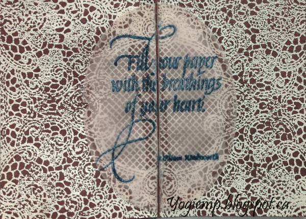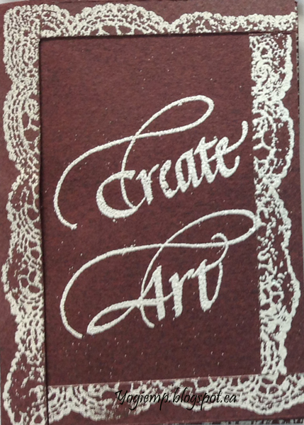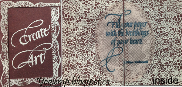 The background is a lace stamp from Just Rite stamped with Distress Picket Fence and embossed with white embossing powder on Canson paper. Trimmed it down to fit a double ATC size. Adhered the two ATC's together. Stamped the quote on a pink toned vellum using Versafine Clair "Twilight" and clear embossing. Die cut with Spellbinders Oval die set. Adhered to ATC with Glossy Accents. Carefully splice the vellum in half. On the front, used leftovers of the trimmed lace and adhered to create a border. Stamped the "Create Art" using the Picket Fence end white embossing powder. |