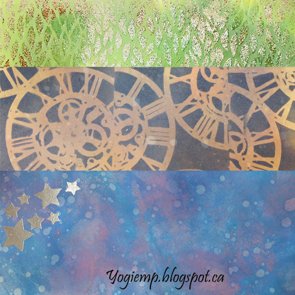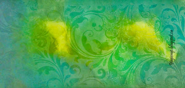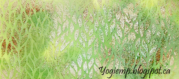 ID: Bkgr's Oxides - Leafy Sponge Twisted Citron. Shabby Shutters, Bundled Sage, Mowed Lawn and Forest Moss. Versamark through stencil and embossed with Emerald Creek Seth Apter embossing powders sprinkling a little of each over everything (Dusk, Lime, Dessert and Taos Sunset |