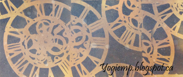 ID: Bkgr's Oxides - Clockwork Sponge Scattered Straw, Brushed Corduroy, Frayed Burlap, Tea Dye, Rusty Hinge, Ground Espresso. Sponged through stencil with Black Soot. |