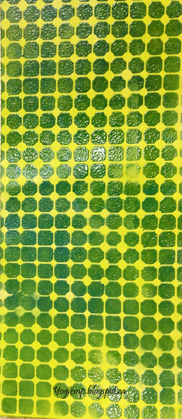 ID: Bkgr'd Oxides - Grid Dots Sponge Twisted Citron. Sponged Faded Jeans through the stencil and clear embossed. |
