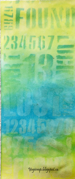 ID: Bkgr'd Oxides - Industrial Sponge Broken China, Twisted Citron. Misted and sponge through the stencil for the lower half and Sponged with the blue for the upper half. Dried. |