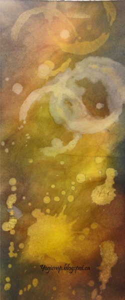 ID: Bkgr'd Oxides - Splatter Sponge Mustard Seed, Tea Dye, Ground Espresso and Black Soot. Mist and sponged water through the stencil. |