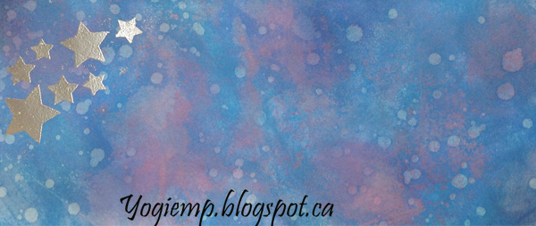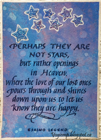 ![]() ID: June/19 - ATC Star Spray - Perhaps They Are Not Stars Stenciled the stars with Versamark and embossed with Emerald Creek "Blue Sparkle" embossing powder. Stamped the quote using Versafine Clair and clear embossed. Outlined with a silver Krylon leafing pen. |
