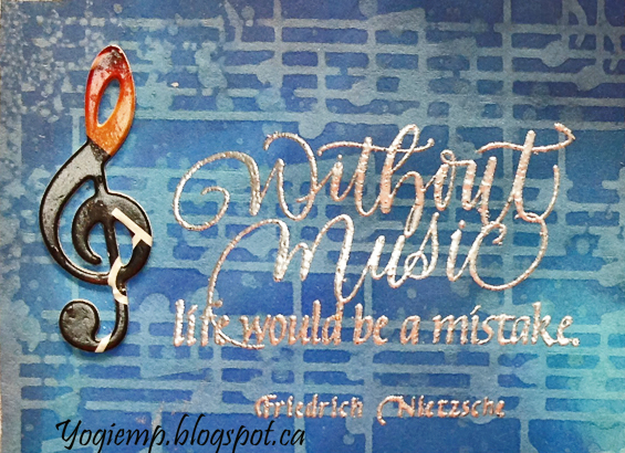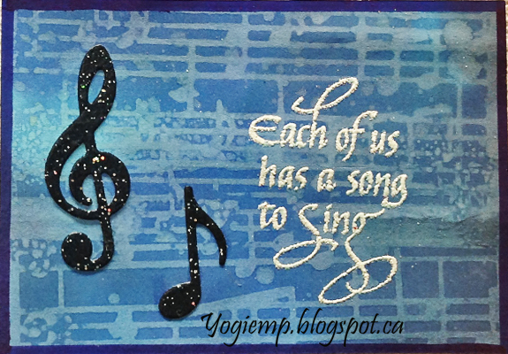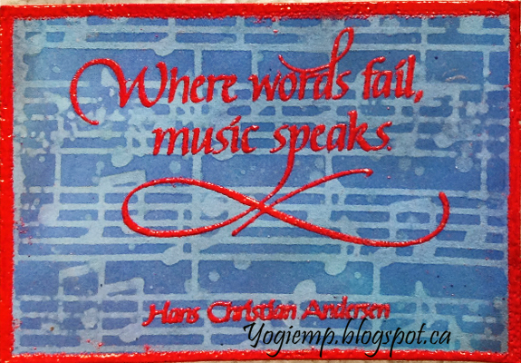 ID: June/19 - ATC Concerto - Where Words Fail Stamped quote using Versafine Clair "Tulip Red" and clear embossed. Outlined with an embossing pen and embossed with the Tulip Red. ID: June/19 - ATC Concerto - Without Music Stamped the quote with Versafine Clair "Morning Mist" and silver embossed. Die cut the treble clef from a tissue box cardstock. Edged ATC with a silver Krylon leafing pen. ID: June/19 - ATC Concerto - Each Of Us Stamped the quote with Distress Picket Fence and embossed with white embossing powder. Die cut the treble clef and note from cardstock, inked with Versafine Clair "Twilight" and embossed with Emerald Creek "Midnight Sky" embossing powder. Edged ATC with a dark blue Zig Writer |