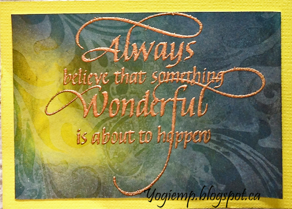 ID: June/19 - ATC Flourish - Always Believe Stamped the quote with Versaafine Toffee and embossed with Queen's Gold embossing powder. Trimmed down and adhered to a bright yellow cardstock.