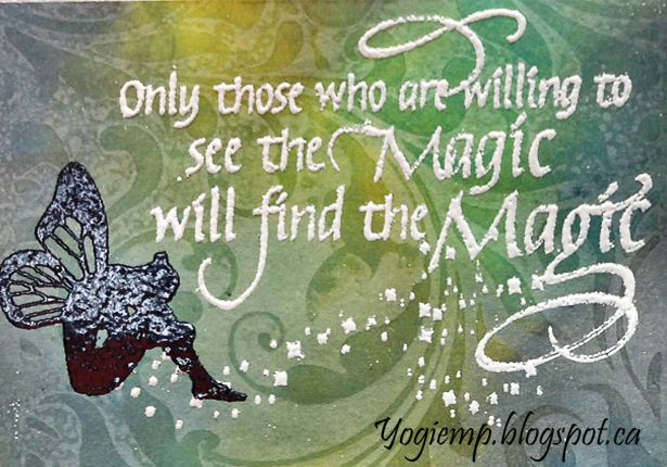 ID: June/19 - ATC Flourish - Only Those Who Are Stamped the quote using Distress Picket Fence and white embossed. Stamped the fairy with black and embossed with Seth Apter "Eclipse" embossing powder.