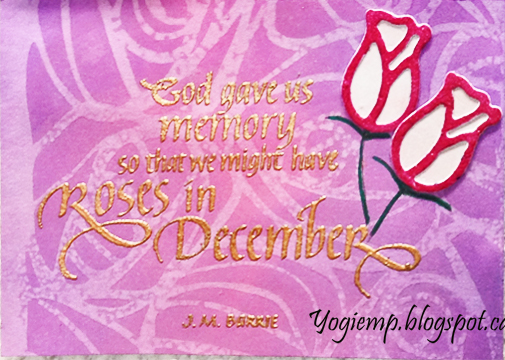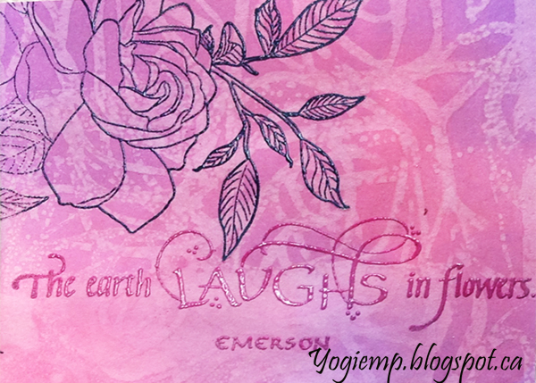 ID: June/19 - ATC Scribbles - The Earth Laughs Stamped the quote using Versafine Clair "Glamorous Pink" and clear embossed. Stamped the flower (The Ton "Magnolia") using Versafine Clair "Morning Mist" and clear embossed. ID: June/19 - ATC Scribbles - God Gave Us Stamped the quote using Versafine Clair "Golden Meadow" and embossed with Queen's Gold. Die cut the roses from white cardstock, inked the outline with the Glamorous pink and clear embossed. Adhered both parts together and then onto ATC. Added the stem with a green colored pencil.