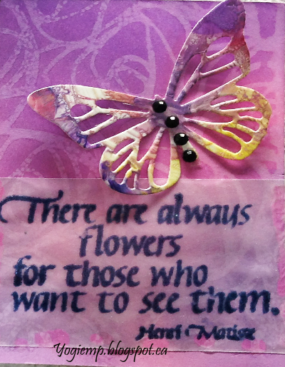 ID: June/19 - ATC Scribbles - There Are Always Stamped the quote onto a tracing vellum using the Twilight and clear embossing. Adhered to ATC with Glossy Accents. Added the die cut butterfly from an alcohol background. Added black rhinestones to the body. |