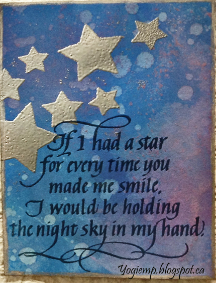 ID: June/19 - ATC Star Spray - If I Had A Star Stenciled the stars with Versamark and embossed with silver embossing powder. Stamped the quote using Versafine Clair and clear embossed. Outlined with a silver Krylon leafing pen. |