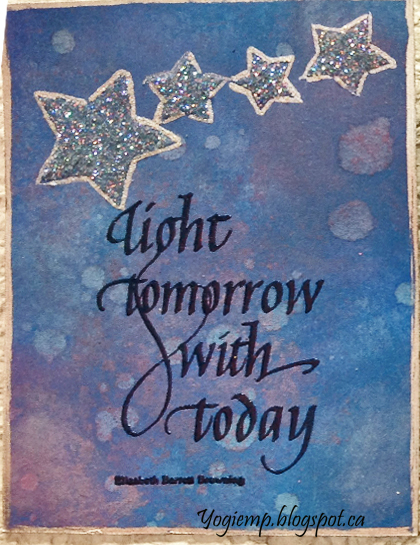 ![]() ID: June/19 - ATC Star Spray - Light Tomorrow Stenciled with Versamark and embossed with Blockheads glue powder and sprinkled with Stickles dry glitter "Star Dust". Stamped the quote using Versafine Clair and clear embossed. Outlined with a silver Krylon leafing pen.