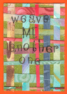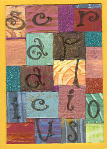 After making a second batch of mini booklet necklaces I had a bunch more waste on my desk, so I took a few moments to create these. I used double sided wide tape on a piece of white cardstock and lay down my scrap pieces in a pleasing design. Then sprinkled some Ritz Glitz (micro fine glitter which I love). Trimmed the piece and mounted it to an ATC blank. Either wrote in my words or rubber stamped them using Versafine stamp pad. |
