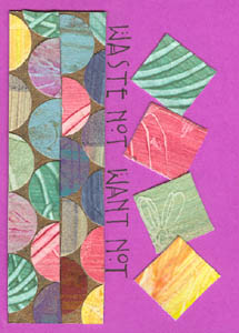 ID: Scrap - Waste Not I had made some mini booklets recently from some hand made paste paper I made a while back and punched out half circles in the mini boxes. These are them. I glued them in a pleasing pattern and added the four little squares. Wrote in the words : Waste not want not" and mounted it al onto a bright fuchsia cardstock. |