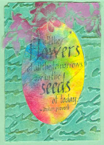ID: Script Seeds (unavailable) I ran a pan pastel background through my Cuttlebug with the script folder. Cut out an oval shape from some tissue paper background. Rubber stamped the quote and the orchid sprig (Darkroom Door "Botanicals"). Cut out the vellum orchid. Mounted to pale green cardstock. |