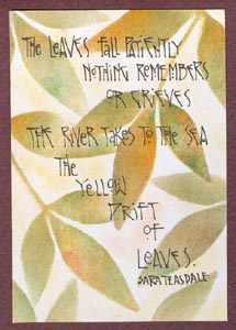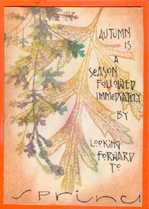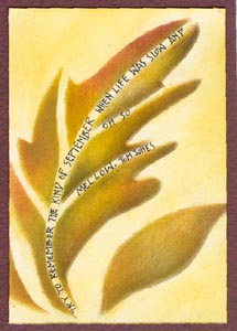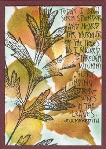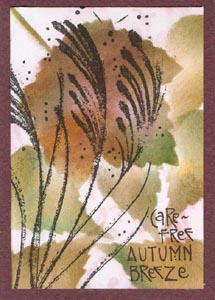 I used a Mylar stencil from Evolving images and Pebbles Pearescent chalks and their cotton balls to do the background leaves. I then over stamped the feathery type leaves (Magenta #C40265) with Versafine black onyx. This reminded me so much of a breeze moving the leaves, hence the words. Mounted it to a reddish brown cardstock. |