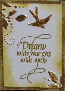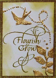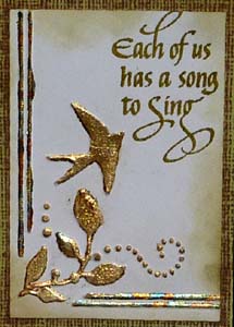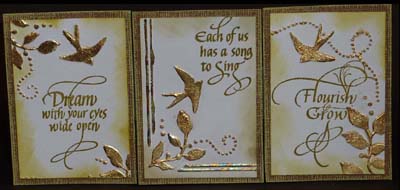 The theme this month over at Paper Pastimes is "Birds". I was rummaging through my embossing folders and saw this Sizzix folder I recently bought and thought would be perfect for a few of them (Sizzix Birds, Flowers Branches set #656503) embossed onto white cardstock. The birds and leaves are basically a border element, and then I cut out ATC sized sections that pleased me. Used Mona Lisa Gold Leaf size and gold leaf to gild the embossed areas. I also used some Green variegated leaf for the linear border on the middle ATC. All quotes are from Quietfire Design and stamped with Versafine Spanish Moss and clear embossed. I then sponged some distress Crushed Olive or Forest Moss around the edges. These were then mounted to core'dinations "The Chocolate Box" cardstock dark brown on one side and when sanded the grassy apple green comes through. These ATC's also cover a few other challenges:
