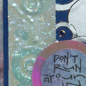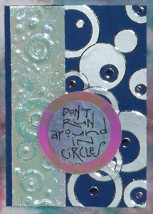 For this ATC I used the white Shimmer Sheetz, embossed with the Cuttlebug Circles & Dots folder, Sanded the high points, brayered some Perfect Medium and embossed with Kaleidacolor. Used a bunch of silver Art Deco circle Peel Offs (Elizabeth Craft Designs) on deep blue cardstock. cut a circle from some pink Shimmer Sheetz and another smaller circle from decorated cardstock. Wrote in my words with a Micron pen "Don't run around in circles". |
