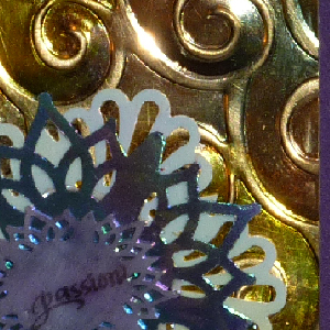 Sanded the high points. Created a couple of my Button Medallions using Martha Stewart Around the Page corner punches "Gothic Arches" & Deco Fan" from some white Shimmer Sheetz and from the Black Shimmer Sheetz. I also punched out another Gothic Arch medallion from some opaque white shrink plastic, rubber stamped the word "Passion" (Quietfire Design) and heat to shrink. Adhered them with Glossy Accents and mounted everything onto a deep purple cardstock. |