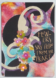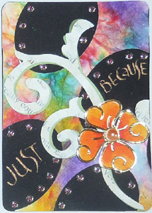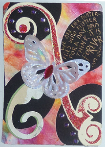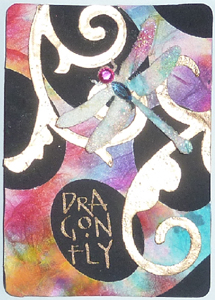 Quite a while ago I had made some background cardstock using dirty Kleenex tissue (dirtied with various watercolors and colored inks) and adhered it to cardstock with a glue stick. I then die cut out ovals, one next to each other for some project or other. I held this leftover piece in my hand and just couldn't throw it away. The colors of the tissue papers were just so vibrant. But there was nothing left, not even room to punch out a Sakura flower... But I kept it anyway. I pulled it out and layered it at an angle on this black cardstock that I had die cut with Tim's Sizzix ATC die. It looked fabulous... I have now used up every drop of that leftover piece of cardstock. By cutting off portions of the ovals, it created interesting shapes. I then put a light coating of gesso onto some book pages and die cut it with Tim's Elegant Flourish Sizzix die. Pieced them and or layered them onto the ATC. Then added my individualistic pieces, a Peel Off flower adhered to a piece of cardstock and colored with Tombows, then cut out and a hlaf pearl center; A punched out Dragonfly from some other Tissue paper cardstock, embossed with Kaleidocolor embossing powder and jewels added to the body; A bunch of Sakura flowers from again another piece of tissue cardstock and rhinestone centers; and lastly a punched out butterfly, double layered and clear embossed plus a Spellbinders Doodle part. As a final touch added some lettering with a Script nib and Ecoline Gold ink. |