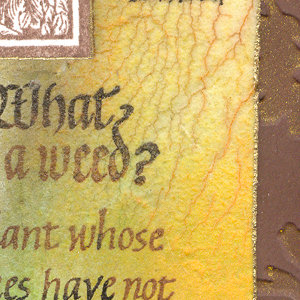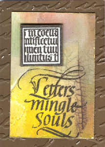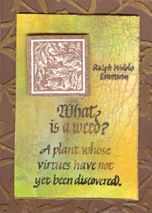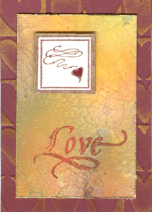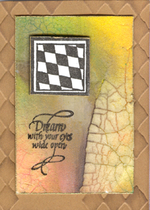 This week's challenge on Created By Hand was to make Inchies. I've made them once before and said then, "what do you do with them?"... Well it looks like I'm making a bunch of ATC's again. I have also been playing with crackle mediums, various brands, on various substrates and colored with various product brands. Having a blast and loving the results. Rubber stamps are by Quietfire Design. "Design Elements" Tile 5pce set; Various quotes and the Dream quote from Mini Images (sometimes called Mini Compilation) Set. The crackle background was made using Golden's Crackle medium and white cardstock. I tried putting a relatively thin layer with just a few higher areas. It's tricky, because if it's too thin it won't crack (or not something you'll see) and if it's too thick I get big craters which I don't want. And if it's too humid no cracks at all.... So it's suggested to use a fan in humid conditions to speed up the drying time - but NEVER use a hair dryer or heat gun. And with this background I decided to try using Vivid dye stamp Re-Inkers, a brand I bought eons ago and never use, but thought it might work nice and it did. I dispensed them in a flat tray with several drops of water, glazing layer upon layer and wiping off with a damp sponge until I got what I wanted. Some portions of the first layer was done with "Yellow" and other portions with "Peach" giving a nice base to allow the luminous colors to show through the layers. It's a pity you can't see this in real life, it glows from within. Other colors I used were, Orchid, a touch of Ultramarine (was very intense so diluted even more), Green, & then Coffee Bean. After stamping the inchies on each cut background I put a layer of Golden's Matte Medium, just to make sure my crackle didn't fall off anywhere. Used my Evolving images ATC Thangs 2nd size up and cut out sections from the background. Rubber stamped the squares using Versafine stamp pad either Vintage Sepia or Black Onyx, then used the same stamp and color on a piece of plain white cardstock to mount with pop dots type adhesive. Both the background rectangles and the inchies were edged with a Krylon Gold Leafing pen. The main ATC cardstock are various shades of brown and rust, each went through my Cuttlebug with an embossing folder appropriate for that Inchy. On 3 of them I also used a Mica stamp pad to color the high points of the embossed images (Gold or Copper) |
