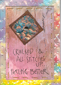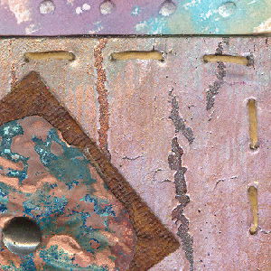 The first ATC I used a stylus on a rubber stamp with light weight copper and got this instead of a crisp design I was expecting. Then distressed with vinegar and salt for a couple days, then sanded lightly and waxed. The other two metal pieces were done on brass backed silver metal (I used the silver side), ran through my Cuttlebug with a floral border embossing folder, layered with Rheotech gesso, then painted, when dry, with acrylic metallic paints (Folk Art; Metallic Inca Gold, Metallic Blue Topaz, Rose Shimmer, Copper. From Deco Art; Metallics Glorious Gold). |