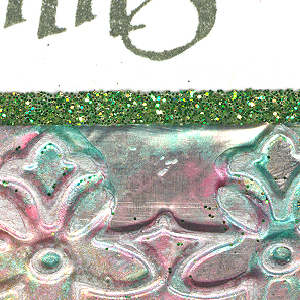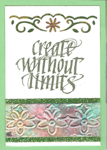 Put a strip of double sided tape down , stuck on my metal piece then sprinkled Martha Stewart glitter "Peridot", and burnished. Used a Fiskar's border punch for the top section, put a piece of double sided tape over the cut outs, then mounted it to a pale green cardstock. Sprinkle Ritz Micro Fine glitter in Chartreuse, Dark Gold & Rose. Rubber stamped the quote (Quietfire Design) with Olympia Green Versafine stamp pad. |