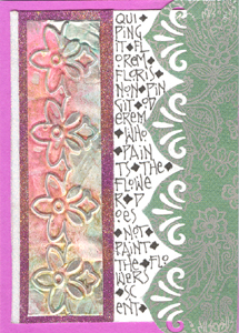 Put a vertical strip of double sided tape, stuck on my metal piece and sprinkled Glitter Ritz Micro fine glitter (Dark Gold and Rose). Then added a 3mm strip with "Warm Highlights". Mounted this to a deep pink cardstock. Punched out a border using EK Success "Morrocan Lace" from a Zyroned metallic paper. Added the words with a micron pen. Words: Qui pingit florem floris non pingit oderem. Who paints the flowers does not paint the scent. |