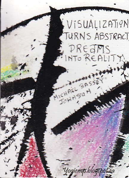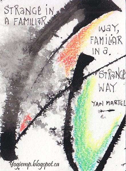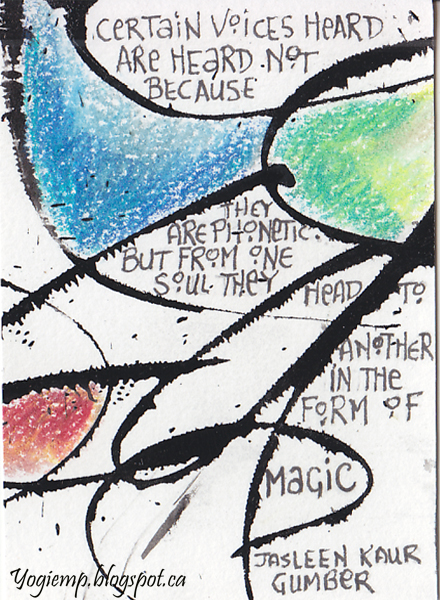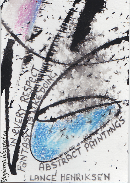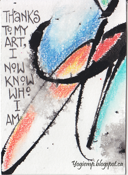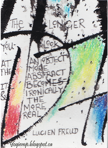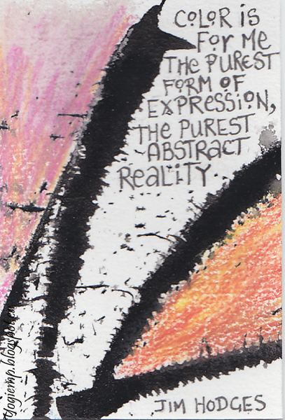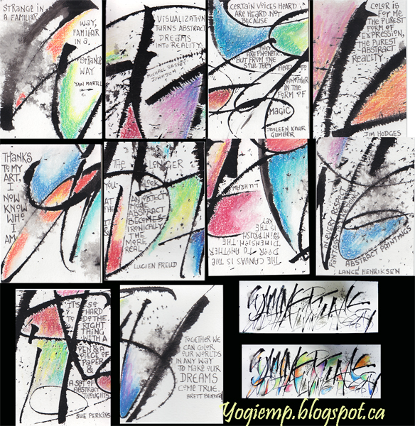 Thought I'd create a 2nd set for July's exchange. I don't know how the encaustic series will hold up in the mail... Wrote out the words "Summertime and the living is easy" on Master Choice watercolor paper (I think it's 140# or more...), Colored areas with Prisma colored pencils blending with a Lyra Splender Blender. Cut apart into ATC size pieces and wrote "abstract" type quotes with a Micron pen. |