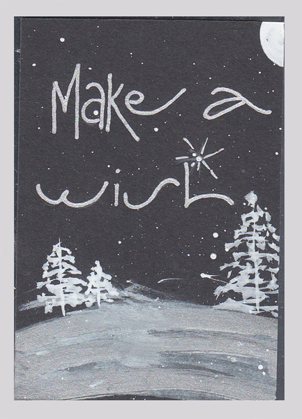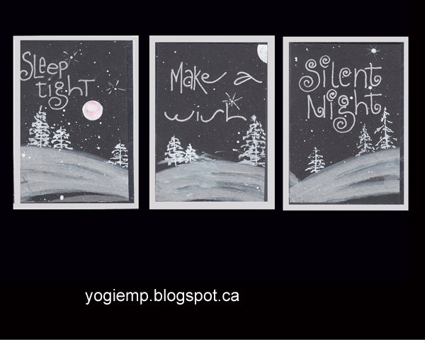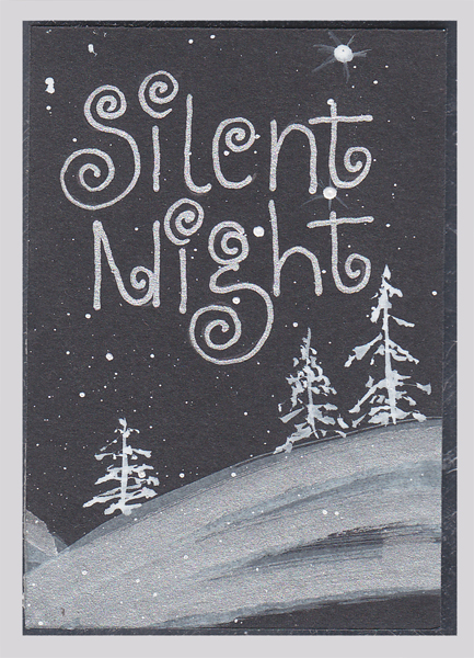 I created the scenes on Michael's black cardstock. Painted with both Holbien Permanent White gouache and then layered with Artistro brush pens, silver metallic. Splattered d painted the trees with the gouache. Wrote in the words with a sliver gel pen. Trimmed down and adhered to silver metallic cardstock.