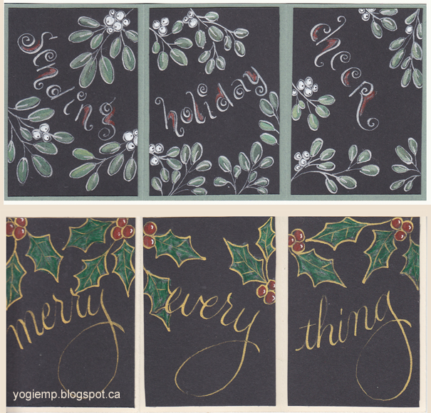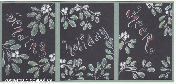 ID: Triptych ATC - On Black - Sending Holiday Cheer On Recollections black cardstock, using Kuretake Silver Mica ink, outlined my design and lettering with a Nikko G nib. Added color with Prisma colored pencils and white gel pen. Adhered to a sage green cardstock. |