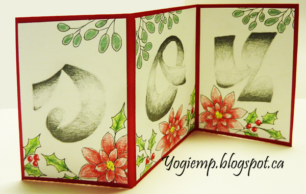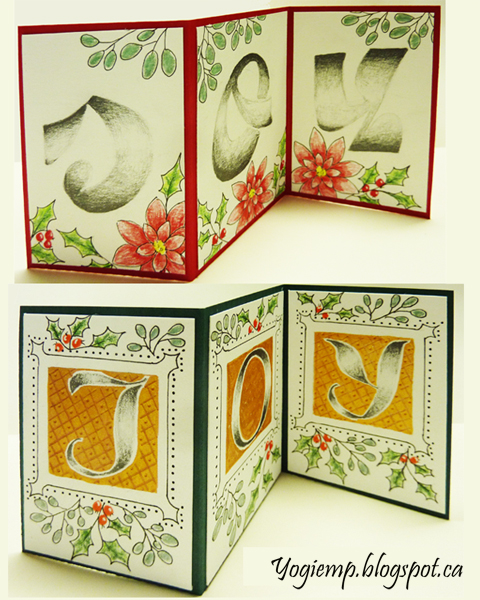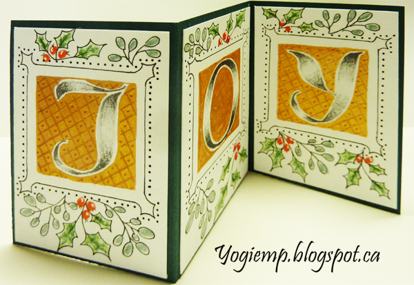 ID: Triptych ATC - Pencil Work & Illumination - Joy On Stonehenge paper drew my letters using Blackwing pencils. Painted the background with Gansai Tambi Starry Colors set "Red Gold" (it looks more coppery rather than golden). When dry, tooled the design with a small balled stylus. Drew in my border and dots with a Micron .02 pen. Added the holly and Mistletoe leaves coloring with Prisma colored pencils. Cut apart and adhered to a green textured cardstock. |