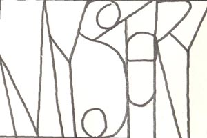 I was taught this technique in a calligraphy class by Cari Imai in March 2009. After doing the one in class, I said to myself I really want to make a few more and this was the perfect way, not too big and not too small. It starts out with two pieces of contrasting (black and white) paper or cardstock of different proportionate sizes So I drew an ATC card and then drew a rectangle inside that which was about 1/4" smaller on each side (this was my black piece of cardstock). Then drew in my monoline letters for the words (words shouldn't be too many letters long - 4 to 7letters, and need to touch top and bottom edges, sides or each other. So I've given you the basic word on the right, cut along each solid line and then placed them on my contrasting cardstock (white cardstock), skewing and re-spacing each cut piece and leaving some of the pieces out all together. Surprisingly you can still read the word. Just goes to show what the mind can untangle. |