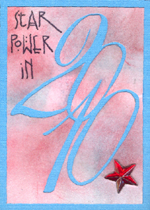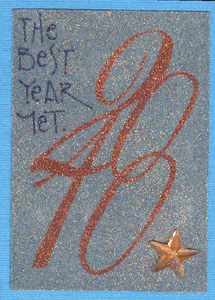 This is done on sticky tape on white cardstock with the "2010" release paper removed and done with Bronze, then the rest removed and done with Regal Red & White. Trimmed and mounted to a baby blue cardstock. A clear star added |
