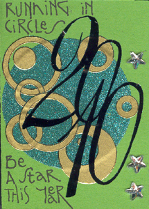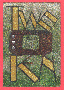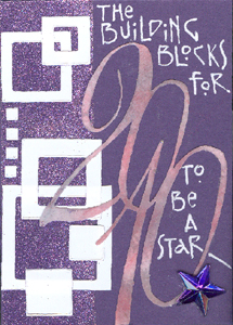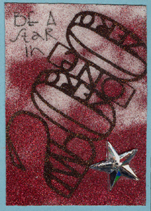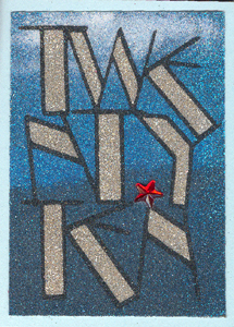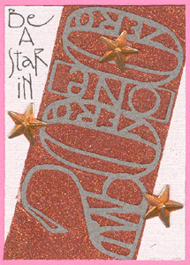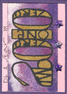 Cut from a grey flecked cardstock and mounted to a strip of tape on a pale pink linen cardstock and done with copper. Mounted to a deeper pink cardstock. Three amber stars added | Done on sticky tape on a white cardstock. Release on numbers removed and done with black, then the background removed and done with two tones of purple and cool highlights, then the inside of the numbers removed and done with gold. Adhered to the pink cardstock and then to a purple cardstock. Three small stars added. |