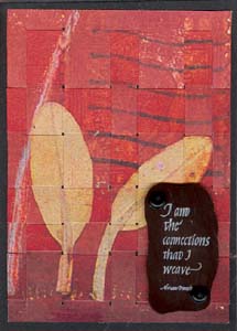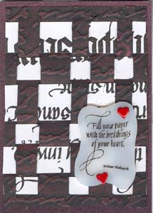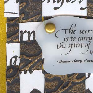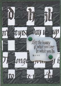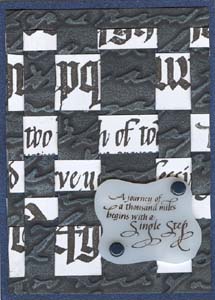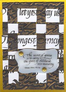 Instructions: First I cut a piece of black cardstock and ran it through my Cuttlebug using the Script embossing folder. Then using my finger rubbed some Rub On's. I used different colors for each ATC. Then I cut a piece of white cardstock large enough to give me all the strips I would need for my ATCs. I rubber stamped several long single line type quotes (all from Quietfire Design) using a Versafine "Black Onyx" stamp pad. I then cut my strips as needed. These also need a sliver cut both form the vertical cuts and the horizontal strips. I rubber stamped the quotes on various types of Shrink Plastic using various colors of Staz On, punched out the holes with a large hole punch (don't forget it shrinks too), then shrunk it in my dedicated oven. When taking it out of the oven I immediately put it on a melt art mat and lay a piece of heavy glass on top so it would cool totally flat. Attached it to the weaving section only with some brads, then glued the weaving to my main cardstock. Mounted to matching metallic cardstock |