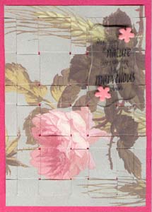Instructions: For the ATCs above you will need two sheets of the identical image. Cut one of your sheets to whatever you want as a finished size. In this case it was ATC sized but a little smaller so I could mount it to another cardstock and have a border around it. On your cut sheet you will be cutting vertical lines and from the other you will match the image and cut horizontal strips to weave through the first sheet. There is a trick to this. When you are cutting your vertical lines, you will need to cut an additional sliver from that cut. Do this on each vertical line. Note if you cut the sliver from the top section on the first cut, continue on all cuts this way. The reason you're cutting these slivers is because when weaving the strips, there is always a mismatch and this compensates for it. When all the vertical cuts are made, position your sheet over the second sheet so that the images align perfectly. Using the slits as a guide, mark with a pencil, dots on the top and bottom of a couple of these lines, this will be the boundaries for cutting your horizontal strips. Cut your strips a bit longer than needed so you have some leeway and can trim when everything is woven. When cutting your horizontal strips, you will also need to cut a sliver from them as well. Again always trim from the same section either the top of the strip or the bottom of the strip. Dab with a touch of glue on the ends it needed. Mount onto colorful cardstock |