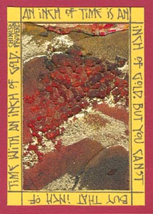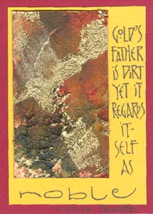 The Bow Valley Calligraphy Guild has a theme of Gold ATC's for this month's Galleria. A while back I got this advertising postcard in the mail. It was a glossy realtors postcard on thick cardstock. For some reason I couldn't throw it away. I thought it would be great to do some alcohol background on it instead. Well that didn't work out the way I had anticipated, so I covered it up with Utrecht's gesso (it's a thick kind of paste type gesso), creating craters and textures. When dry, I used Golden's fluid acrylics to paint the the gesso. I love the colors (Jenkin's Green, Quinacridone Burnt Orange & Iridescent Bright Gold). Then rubbed some "Rub On's" metallic colors. I had put it aside and forgot about it. Was cleaning up and found it and decided with a bit of gold leaf on it, it would be perfect for our theme. So I used the wide chisel tip Zig 2 way glue stick and just swiped it across randomly. Stuck on the composition gold leaf and then lightly sanded a few areas where there was too much gold. I was very happy with the results. Cut out small rectangular pieces and stuck them to a bright yellow cardstock. Wrote a quote with a Micron pen. Then mounted it to a "Heritage" red cardstock. |