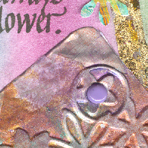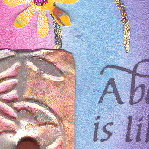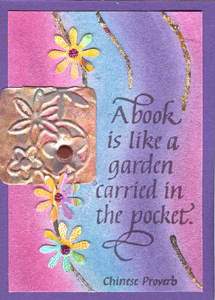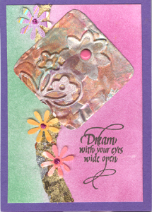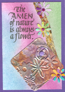 Over at Saturday Workout the challenge this week is to use silver metal or tape. I had fun doing distressing on silver and copper metal the past few days, so thought I'd whip a few ATCs with them for this challenge. Each of the silver distressed pieces are from the same strip. It's a light weight silver on one side brass on the other. I used the silver side, embossed the design using my Cuttlebug and a floral border embossing folder, spread a thin layer of Rheotech gesso, leaving spots of silver. When dry layered glazes of acrylic metallic craft paints. The background cardstock is colored with Pan pastels, then either a thick or thin curve of a Zig glue stick, and variegated leafing. The metal piece is adhered using Golden's extra heavy gel medium and then I also added a color round brad. Mounted each to a deep purple cardstock. Each of the quotes is a rubber stamp from Quietfire Design which I stamped using versafine stamp pad either Olympia Green or Imperial Purple. I then punched out daisy like florets, using a Marvy small punch, from some hand made marble paper I made a while back. Added a Stickles center in deep rose to each. |