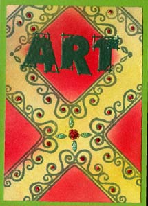I used a stamp positioner for all these ATC's and white cardstock. I stamped the corners with Adirondack Rainbow dye ink stamp pad. Colored everything with Pan Pastels. Made a mask for the square and used Permanent Red. Rubber stamped the word "ART" with Dark Green pigment ink and emerald embossing powder. Mounted it onto a bright green cardstock. Added some Stickles details.