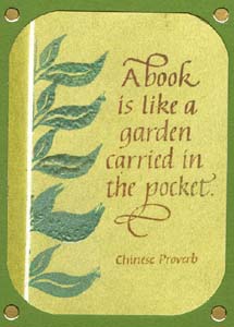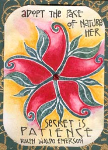 I cut out a positive oval shape and stuck it to my ATC, then repeatedly rubber stamped the leaf image using Distress Mustard & Adirondack Rainbow Dye ink pad. Removed my oval and rubber stamped the quote (Quietfire Design Quote Marks "Nature" Set). Mounted to a medium green colored cardstock.