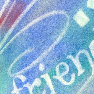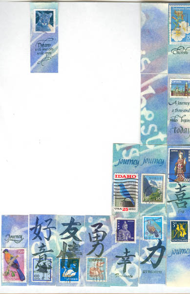 This background starts out with a piece of cream toned LBS end paper from Columbia Mills approx 8.5"w x 12"h. I smeared several colors over the surface (Ultramarine Blue, Turquoise, Phthalo Green and a touch of Permanent Red). Wiped the surface with a make up pad and then applied more color. Using an eraser I removed color in various sections either as a lightening bolt stroke, or the square edge of the eraser, or using a pencil type eraser and a plastic stencil to create words. When done, I sprayed it with Krylon Workable Fixative. Then cut out my Moo sized pieces (they're really small at 1.1" x 2.8") |