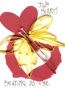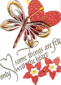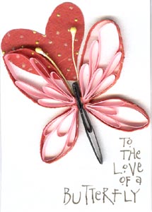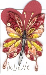 Since I did dragonfly quilled ATCs I figured I better do some Butterfly ATCs. And this week's CBH Challenge was to use a "Love Quote" - so one of these butterflies also has a Quietfire Design Love Quote on it. The are all mounted to a Pearlized Metallic white cardstock. The 1st butterfly is the CBH Challenge ATC with the smallest version of a butterfly. I added some Glitter Ritz in some of the open cells in gold and red. Added the yellow stamen for antennae. It's done with silver and copper quilling strips. I punched out the Heart (Sizzix die) and the flowers (EK Success punch) from some gold embossed red mulberry paper. Added a white pearlized center and tehn a yellow Stickles dot. The quote was rubber stamped with Versafine Black Onyx. (I think it's my favorite of the butterflies... The 2nd butterfly is done with pink strips and the outer portion with the gold embossed red paper., black body and pearlized cream toned antennae. The words are done with a micron pen. The 3rd butterfly is done with yellow strips and a gold embossed yellow paper, copper body and pearlized cream toned red dot antennae. The 2 hearts are punched out (Sizzix) from Bazzill Monochromatic red cardstock.. Words done with a micron pen. The 4th butterfly is a labour intensive one and is the first one I did... Lots of coils inside the husked shape in yellow, flesh tone, & red, husked in copper with a black body and pearlized cream toned antennae. The heart stick above the ATC size. The word is done with a micron pen. |