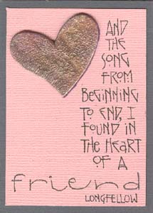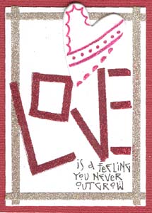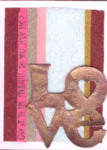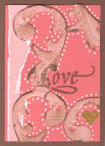 I punched out the curlicues (Spellbinders Borderabilites #S7 004) from some pink textured cardstock, then shaded it with some distress pads and a Versafine pad (Vintage Sepia). Cut out sections of it to glue to the ATC. Rubber stamped the word "Love" (Quietfire Design) with the same stamp pad. Added the white dots with a Ranger's Inkssentials pen. Mounted it to a deep brown cardstock. |